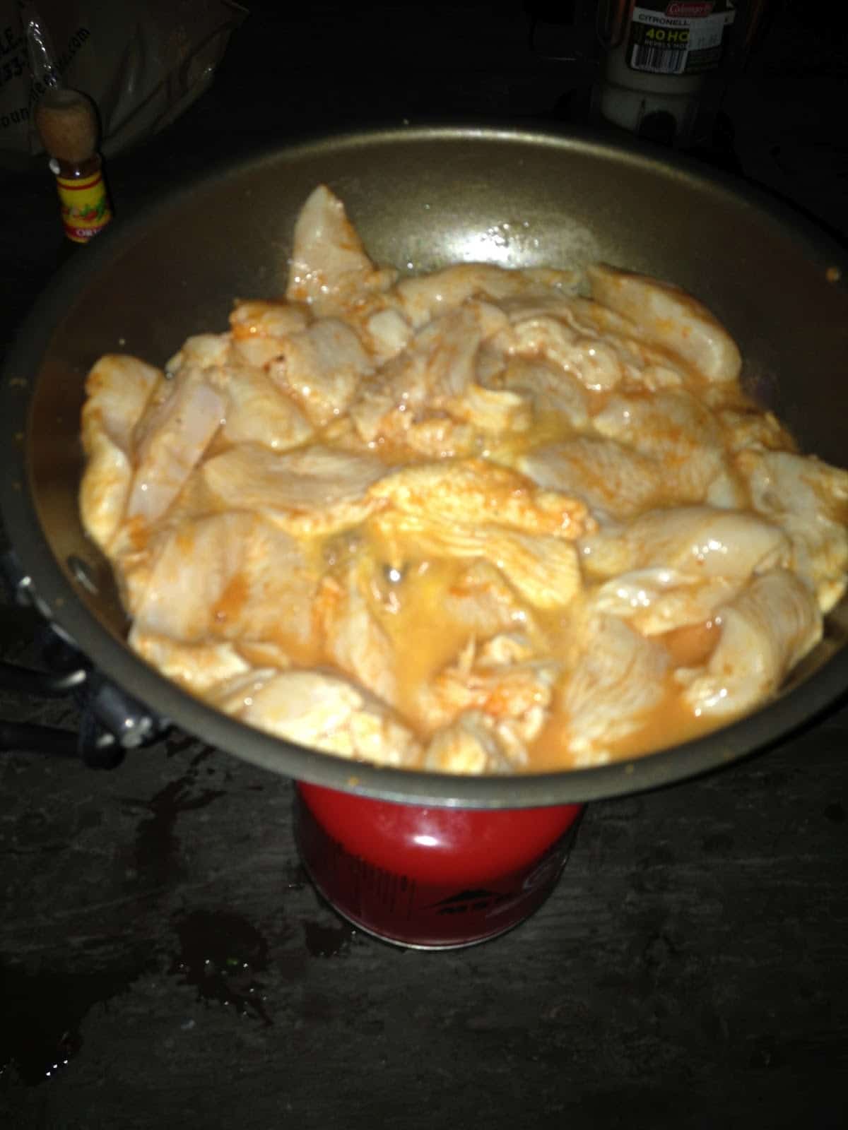 - Place your vegetables in a pan over your camp stove with a little salt. Saute until they are tender, about ten minutes. (If they are cooking too slowly, add a couple tablespoons of water and cover the pan with tin foil.) When the vegetables are cooked, place them on a plate/bowl and cover tightly with tinfoil while you cook your chicken.
