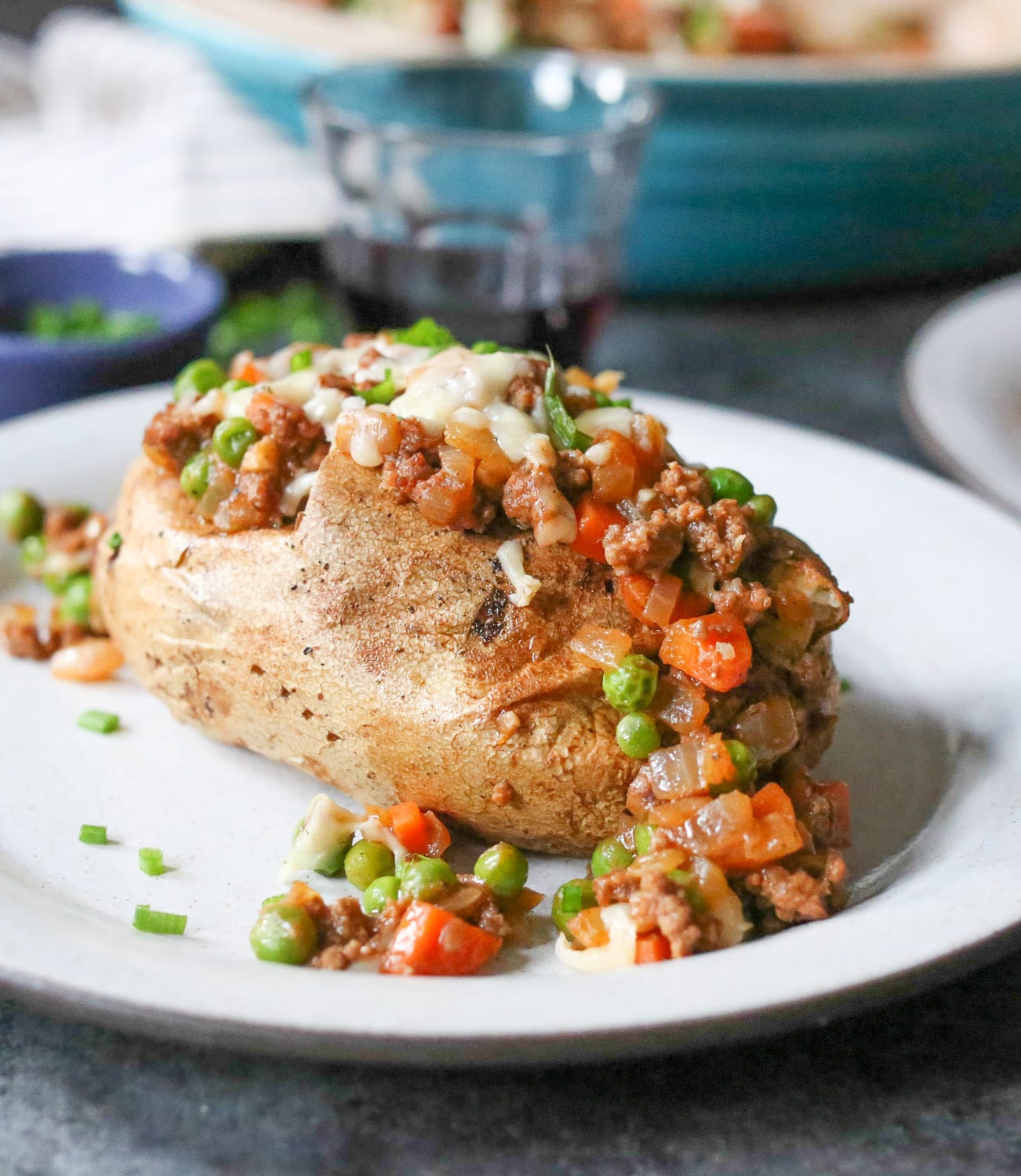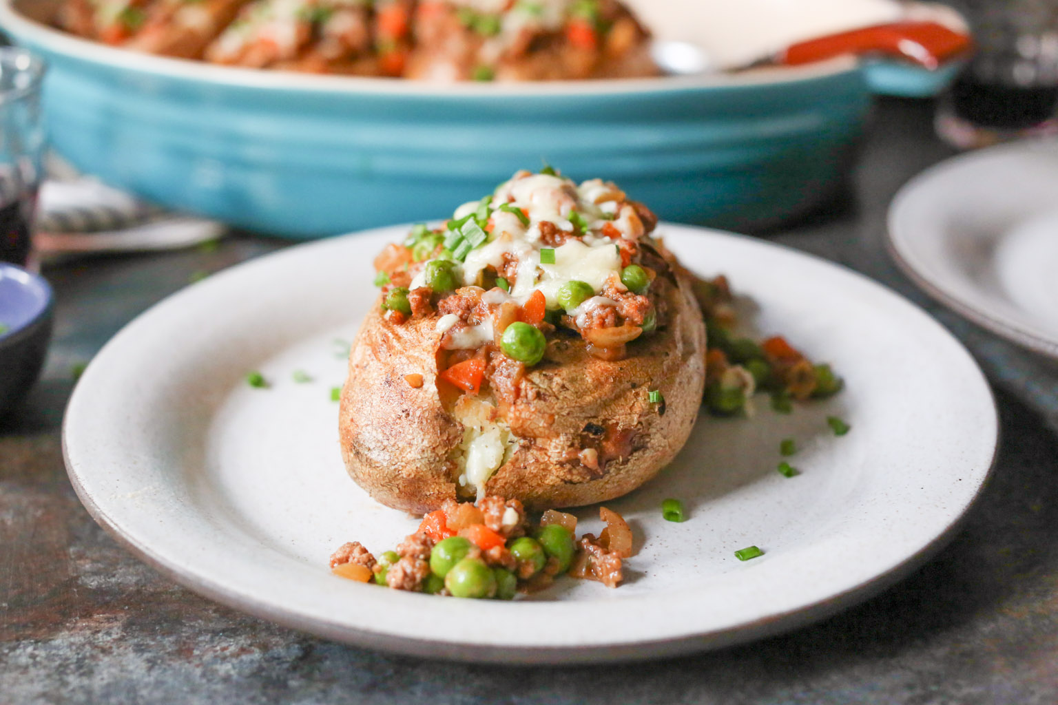 - Split the baked potatoes almost in half lengthwise (you still want them to remain intact on their undersides), drizzle the inside of each with a teaspoon of olive oil, and sprinkle with salt and pepper. Roughly mash the flesh with a fork. Fold a tablespoon of Gruyère into each potato’s mash. Load each potato with a quarter of the beef filling (some will come out the sides, and that’s okay!) and top with the remaining cheese. Return to the oven for 5 minutes just until the cheese has melted. Serve warm.