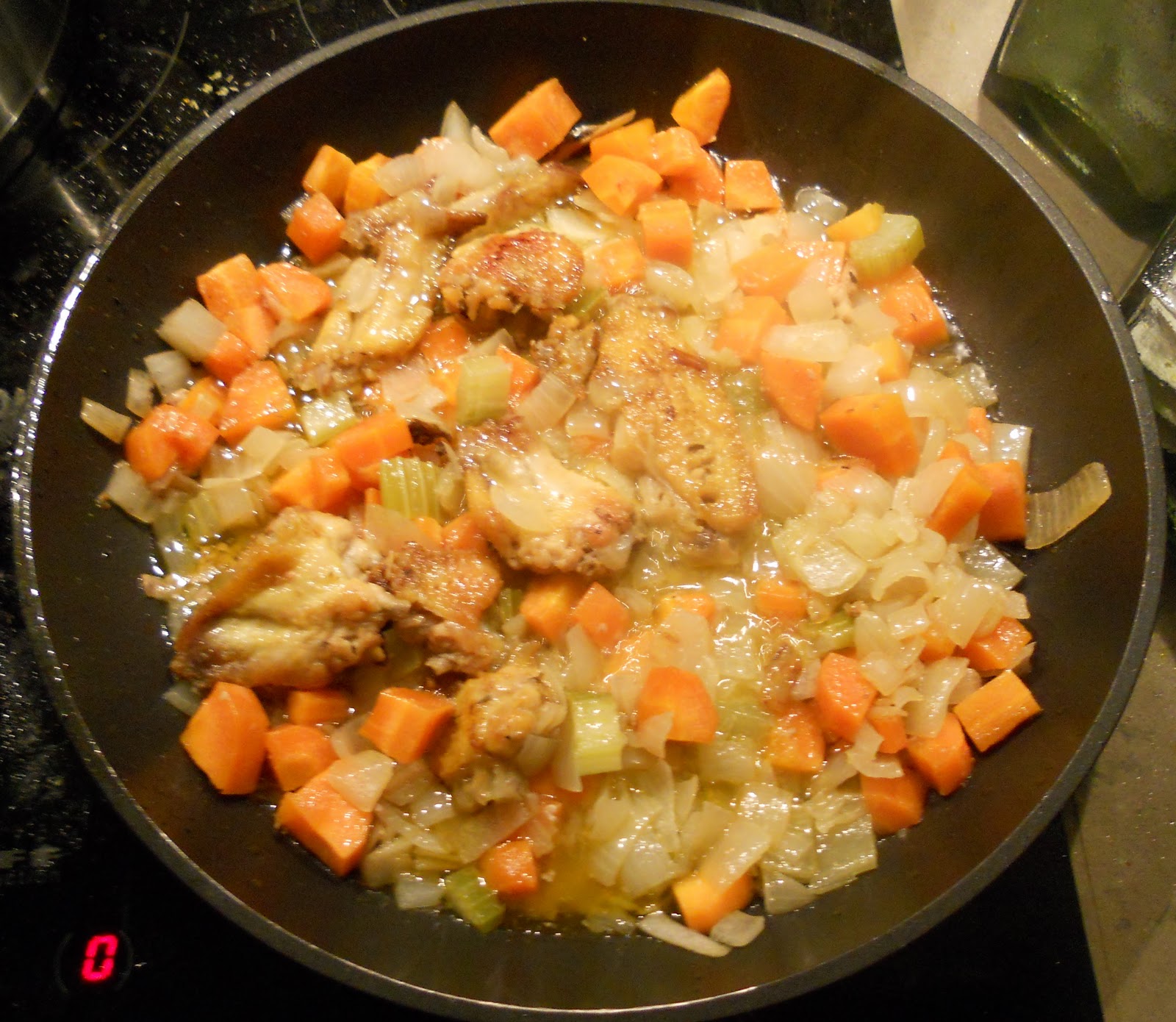 -Peel your carrots, celery, and onion, and then chop each mirepoix- this is a fancy French term that I shall poetically translate as “rough cubes.”