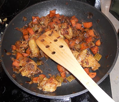 -Heat some oil in a saucepan, and when it is very hot (spitting), add the chicken wings. Keep on the heat until they are a golden brown, stirring intermittently. Remove from heat.