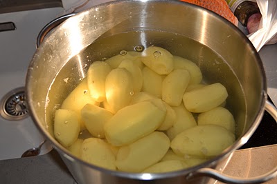 -Wash and peel the potatoes and put in a large pot of water with several pinches of coarse salt. (They will cook faster it you cut your potatoes in half.)