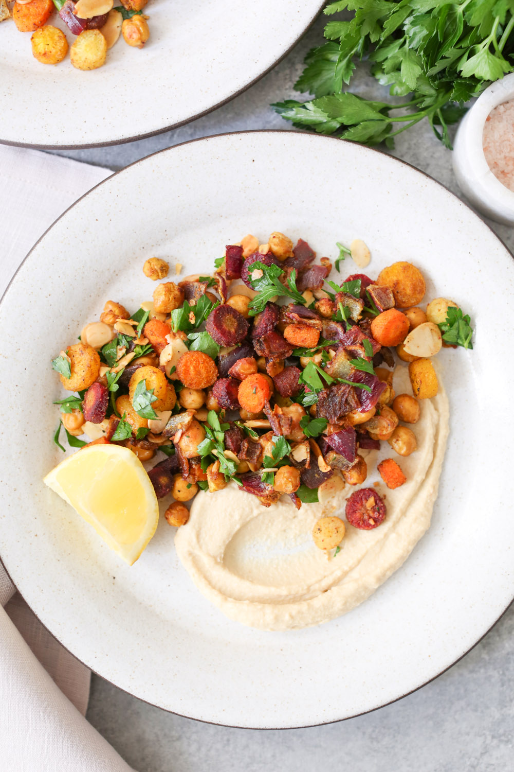 - -Stir in the toasted almonds and parsley, and serve alone or over hummus (or greens!) with an additional squeeze of lemon.
