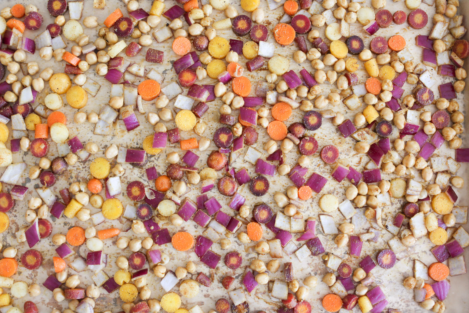 - -Pre-heat the oven to 425 degrees. Line a rimmed baking sheet with parchment and set aside. Cut the carrots into ¼-inch rounds, and place them on the baking sheet along with the onion, chickpeas, and coconut oil. Toss well and add the spices, salt, and pepper.