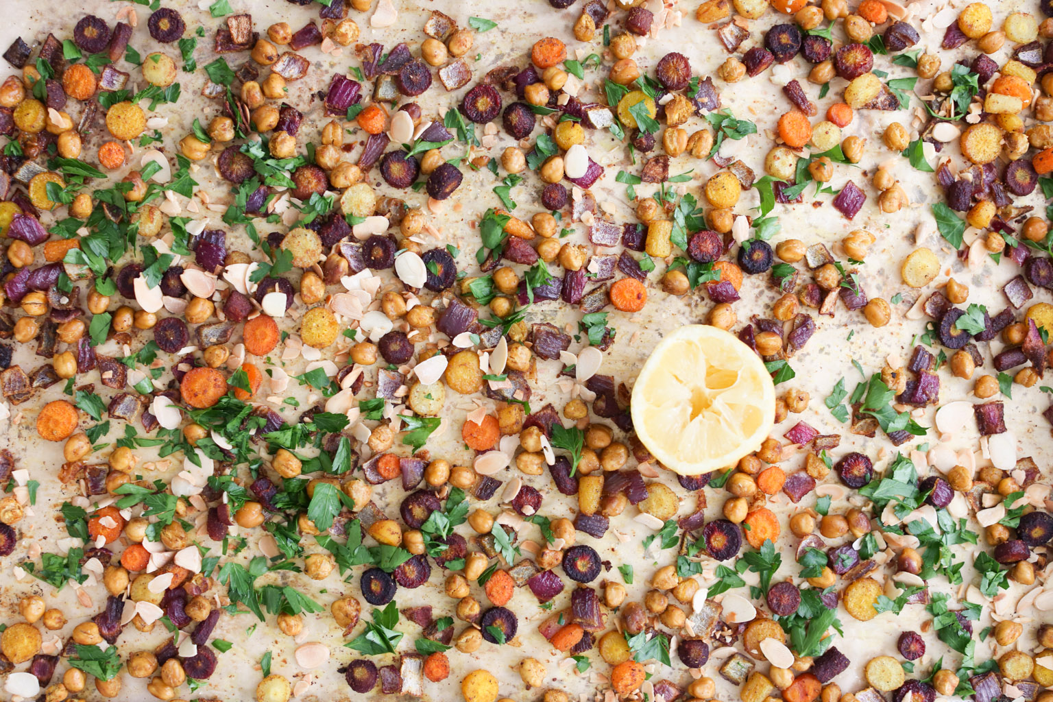 -Pre-heat the oven to 425 degrees. Line a rimmed baking sheet with parchment and set aside. Cut the carrots into ¼-inch rounds, and place them on the baking sheet along with the onion, chickpeas, and coconut oil. Toss well and add the spices, salt, and pepper.