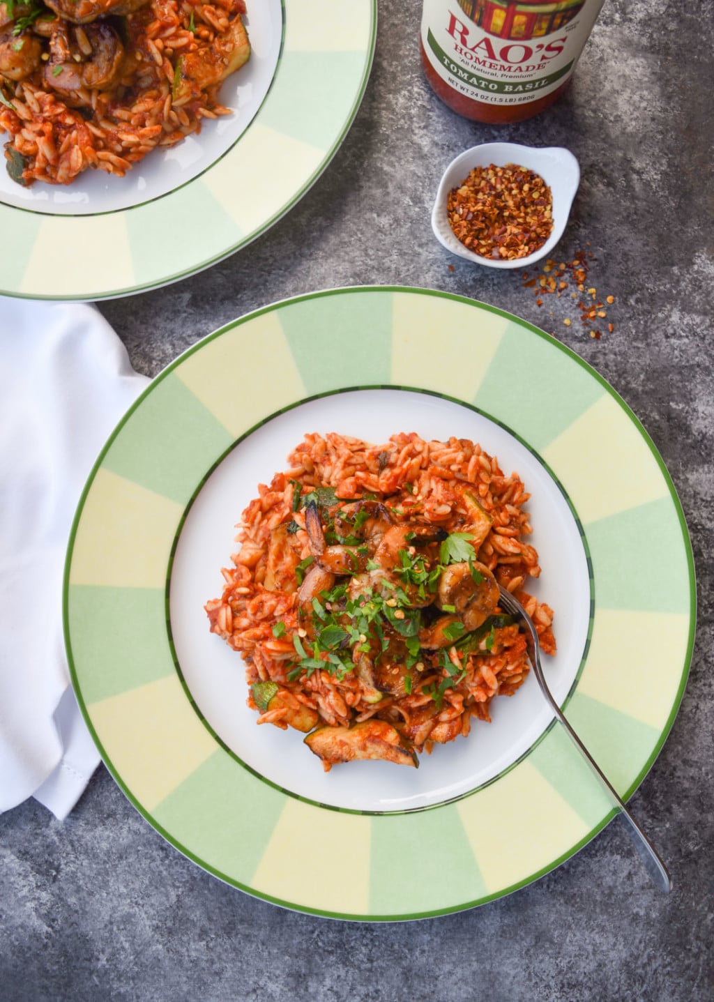 And now for some you do you options! Not a shellfish fan? Grilled salmon, steak, and chicken paillard (all can be marinated like the shrimp) are awesome protein options. If you don’t have orzo on hand, try this recipe with your favorite short pasta—casarecce, campanelle, and rotini are personal favorites. On the sauce front, I love the bright, fresh flavors of Rao’s Homemade® Tomato Basil Sauce, but the Arrabbiata, Marinara, or Roasted Garlic Sauce would be equally delicious. (Honestly, you can never go wrong with any of the Rao’s Homemade sauces.) And if you’re moved to add some cheese into the mix, I support you!