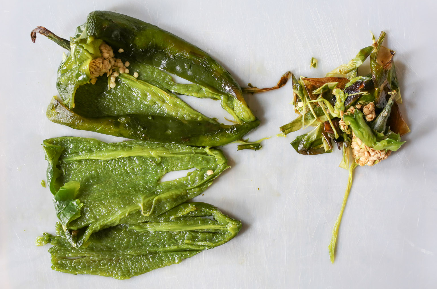 - Meanwhile, char the poblanos. Pre-heat the broiler on high. Place the peppers on a baking sheet and broil for 10-15 minutes, turning the peppers every few minutes, until softened and lightly charred in spots. Let the peppers cool to room temperature, then remove their skins. (You should be able to easily peel the skin off easily with your hands!) Slice the peppers in half, and remove and discard the seeds and stems. Finely chop the peppers and briefly set aside.