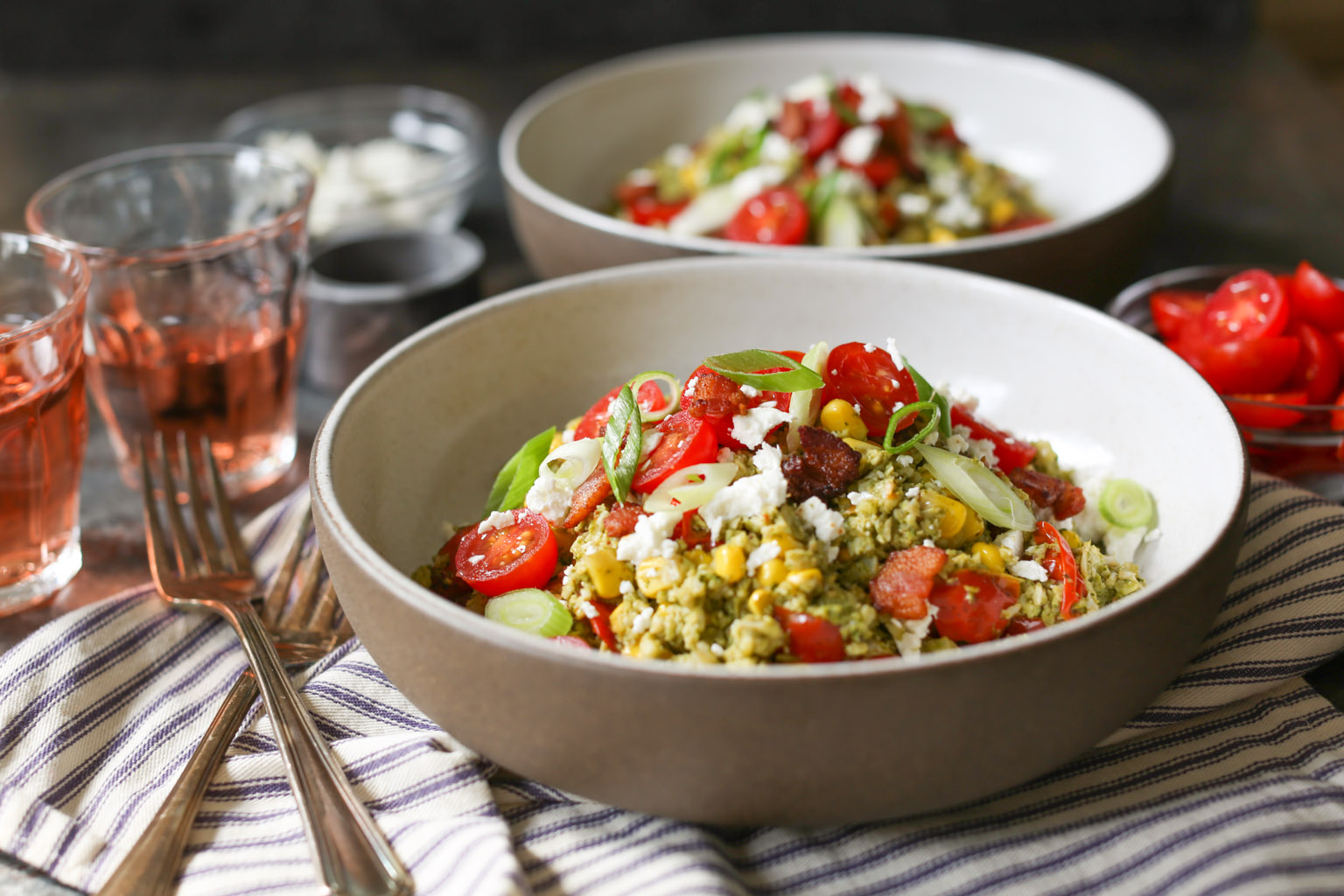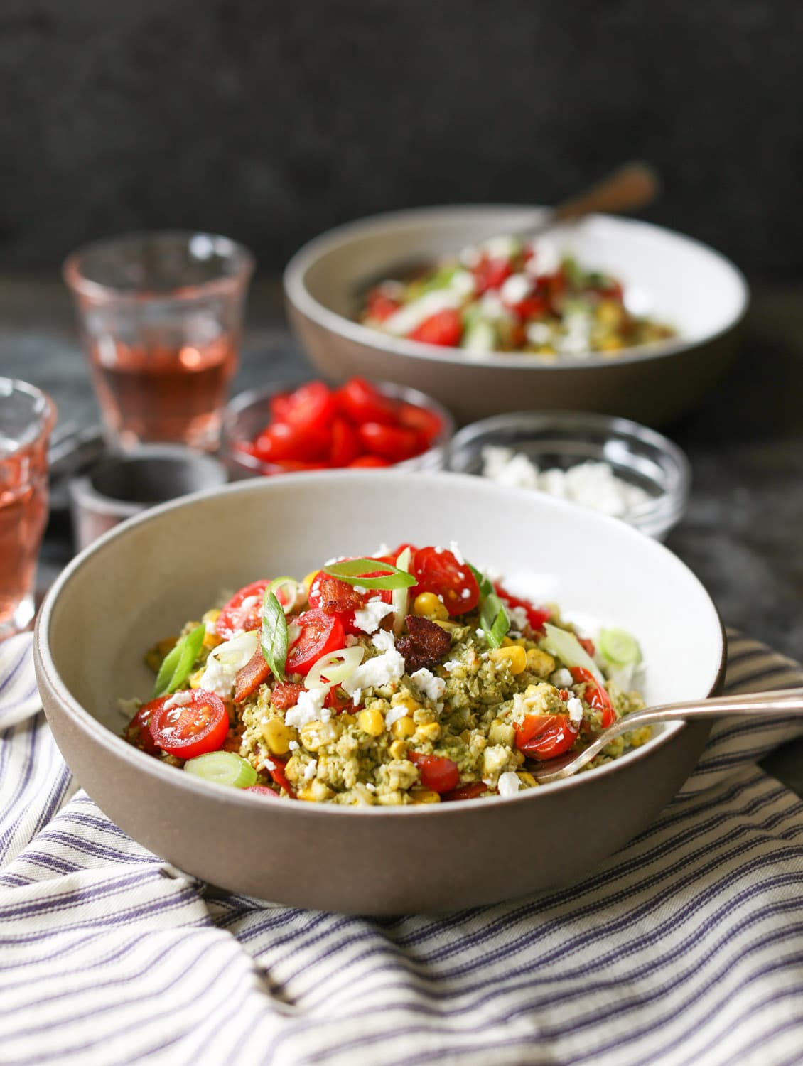 Summer Cauliflower Rice Bowls with Bacon and Pesto