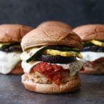I also snuck more than a full serving of vegetables in there because God knows you all need the vitamins and anti-oxidants. Plus, grilled eggplant, zucchini and squash add unbeatable texture and heartiness to these chicken parm burgers. Trust me, you’ll dig it.