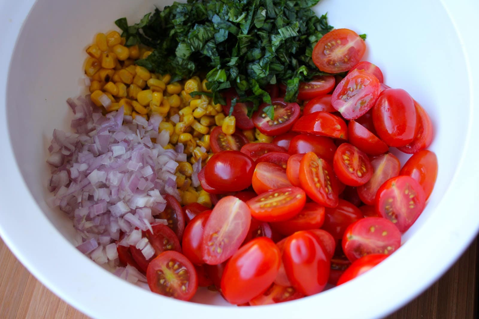 - Slice the cherry tomatoes lengthwise and add them to the corn along with the minced shallot and chopped basil.